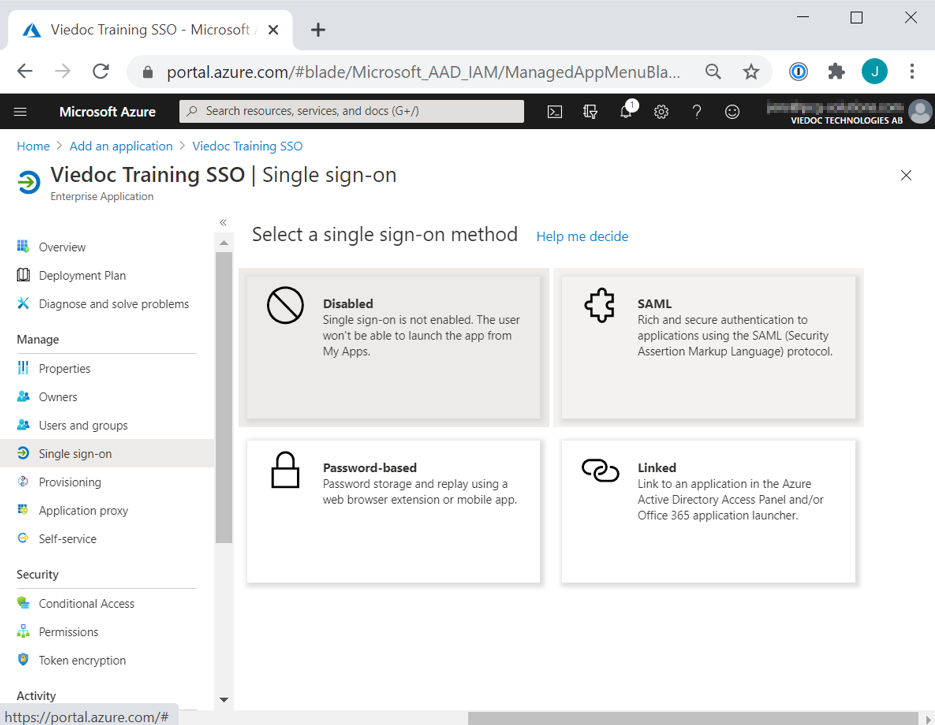 https://www.viedoc.com/viedoc-msaad-sso-256x256.pngから Viedoc のロゴをダウンロードし、Azure AD タブのプロパティセクションにアップロードします。
