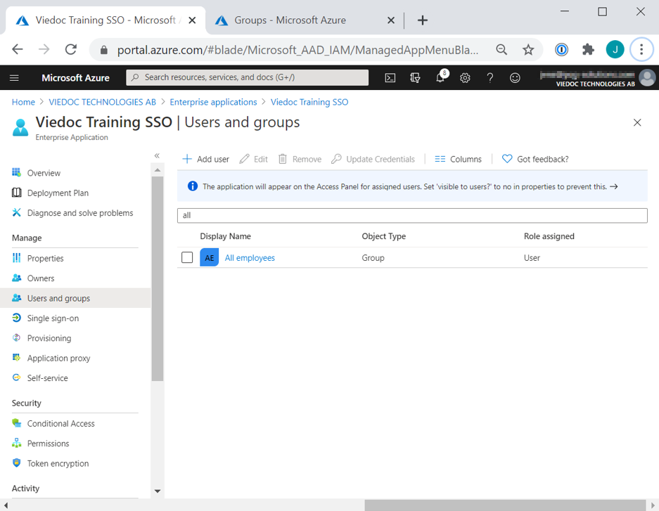 Users and groups下に、SSOを使用してViedocにログインできるすべてのユーザーまたはセキュリティグループを追加します。