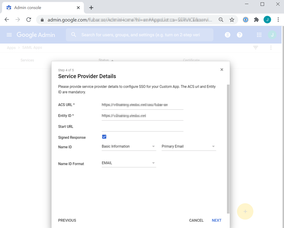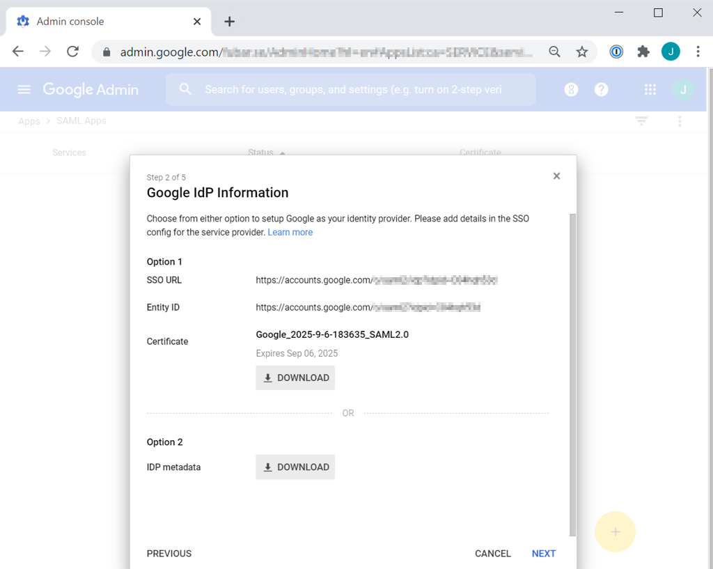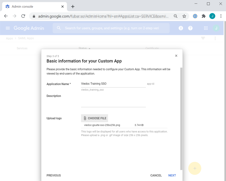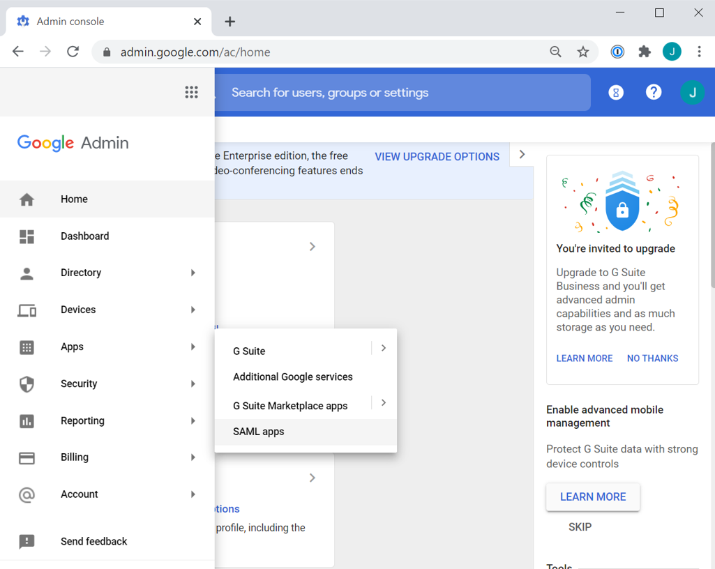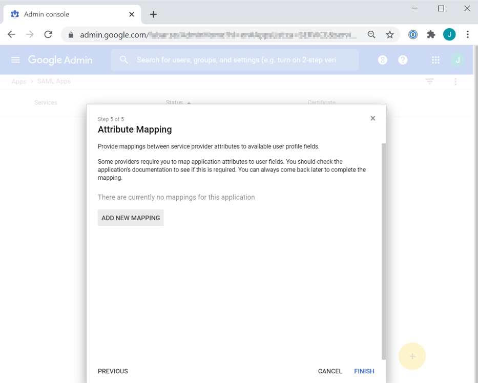 別のタブで Google Workspace Admin Console にログインし、Apps > SAML apps に移動します。