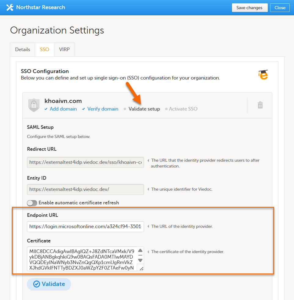 Viedoc Adminで、組織設定を選択し、シングルサインオンタブを開きます。設定の検証を選択します。 Redirect URL および Entity ID をコピーします。