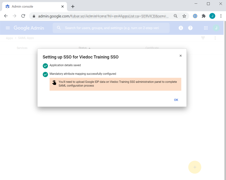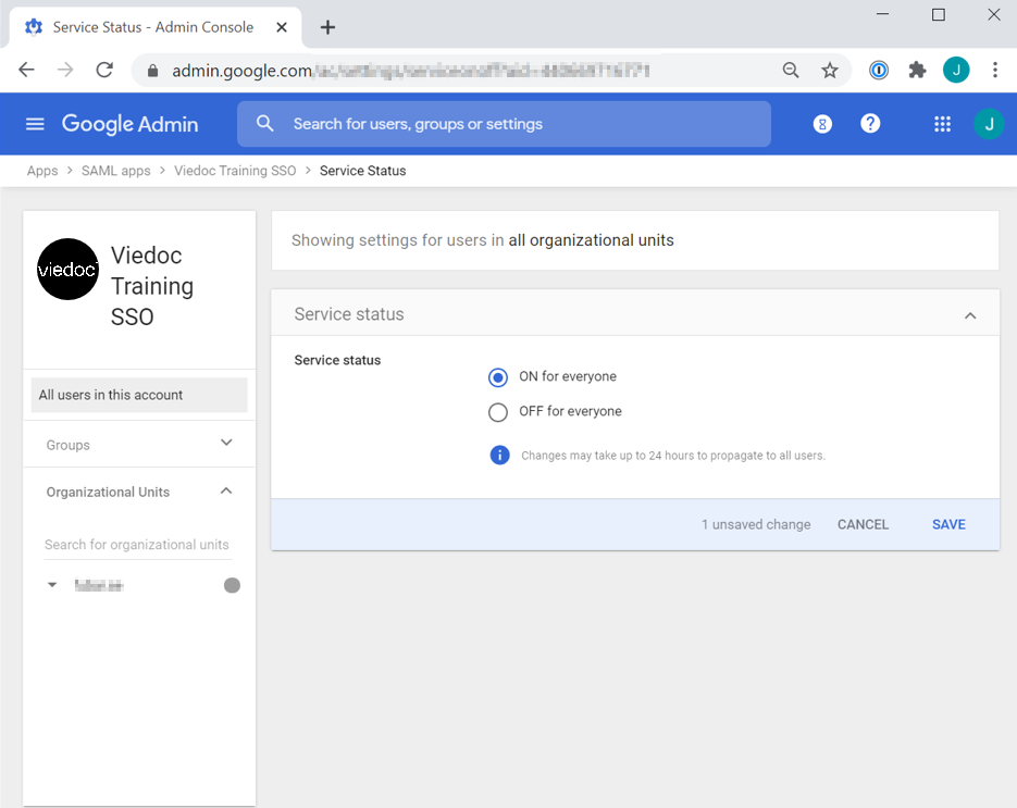 最初のタブに戻り、Viedoc の組織設定からシングルサインオンを開きます。 Google IdP Information ウィンドウから: