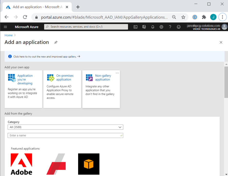 別のタブでMicrosoft Azure portalにログインし、 Azure Active Directoryにすすみます。 Enterprise Applications > New application を選択し、Non-gallery applicationに進みます。