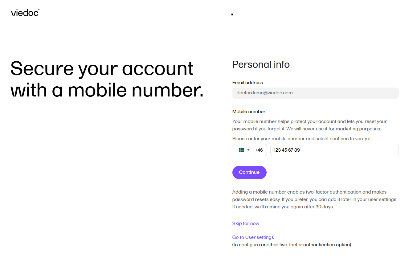 Adding a mobile number enables two-factor authentication and supports password recovery. If you skip this step, the system reminds you after 30 days. |