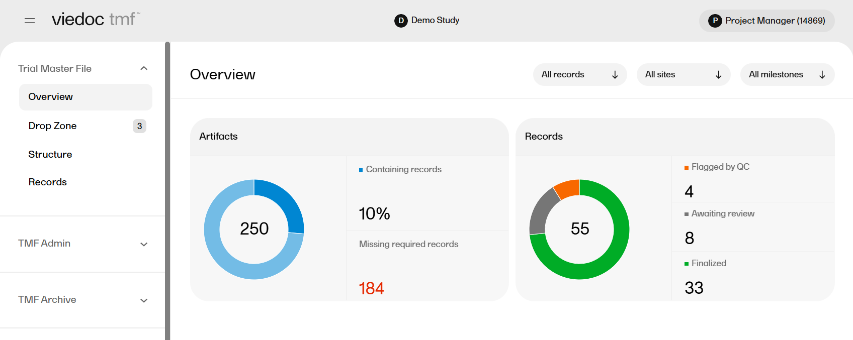 To open the Overview page, select to expand Trial Master File in the left navigation menu and select the Overview page.