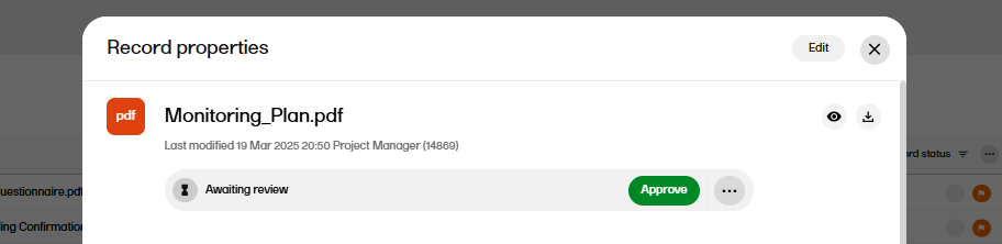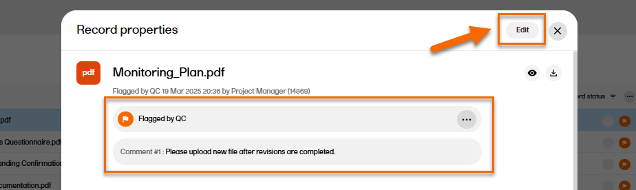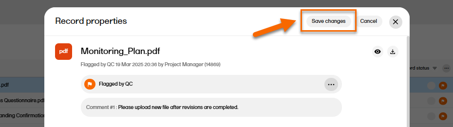 - A user with write permissions for the artifact in the same scope (trial, country, or site) that the record is assigned to can then make changes to the metadata or upload a new file to address the review comment, which will change the record status to Awaiting review.