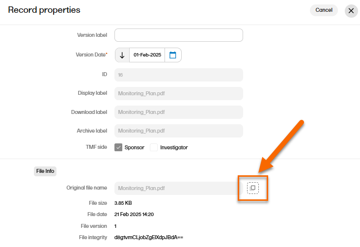 In the Record properties window, edit the applicable record metadata. To upload another file, select the upload button in the File Info area.