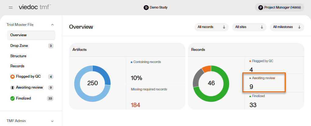 未公開の記録が編集され公開された場合、またはQC用にフラグ付けされた記録が編集され公開された場合、その記録の状態は「レビュー待ち」に変更されます。Viedoc TMFで記録をレビューし承認するには、その記録が割り当てられているのと同じスコープ(試験、国、施設)のartifactに対するレビュー権限が必要です。承認されると、記録の状態は「確定」に変更されます。