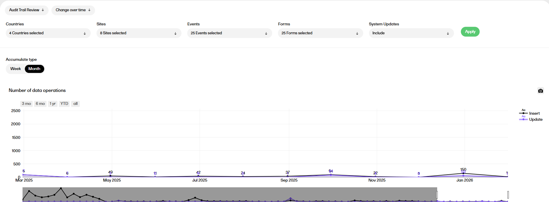You can now see the data operations by country, site, event, and form. You can also see the data operations by item (top 20), which only appears if plot type Count is selected.