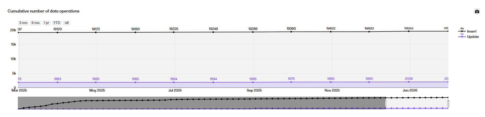 The Cumulative number of data operations plot displays a timeline across the study start until now, rendering the cumulative number of Inserts or Updates done since the start of study up until that time point.