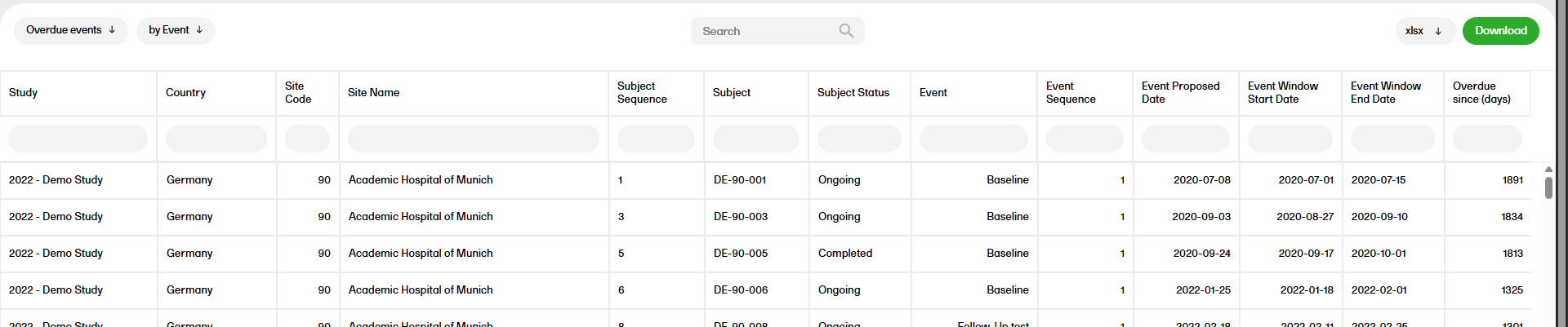 - Study, Country, Site Code, Site Name, Subject Sequence, Subject, Subject Status, Event, Event Sequence, Event Proposed Date, Event Window Start Date, Event Window End Date, Overdue since (number of days)