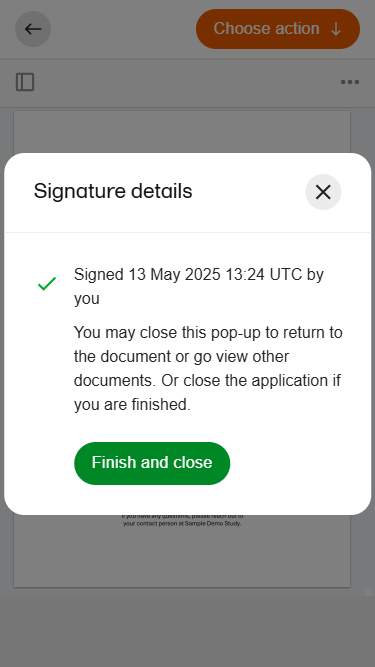 Close this pop-up to return to the document view. From there you can complete other actions such as downloading the document, or navigating to the document list to view other documents. If you are finished, select Finish and close to close the application and sign out of Viedoc Me. |