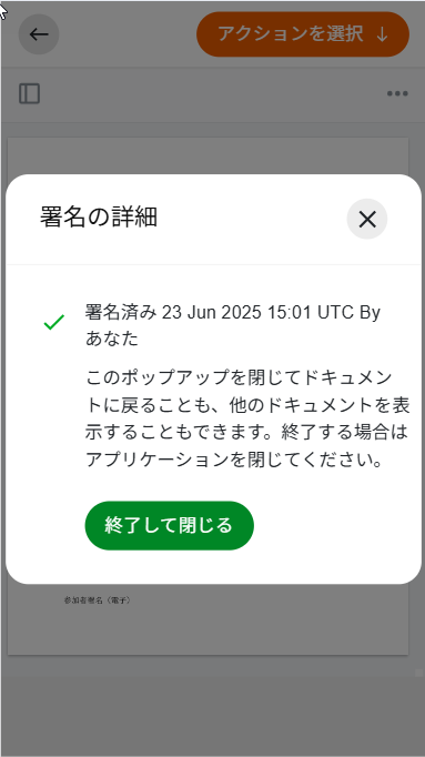 署名の詳細が表示され、ドキュメントに署名したことが確認されます。