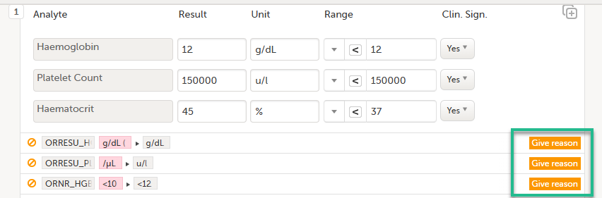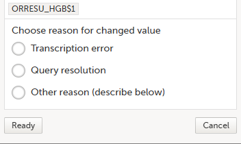 6. アクションボタン : 選択したいフィールド(項目)のアクションボタンを選択し、実行したいアクションの種類を選択します。(例:データがないことを確認する、プライベートノートを追加する)詳細は、欠損データであることを確認する、およびプライベートノートを参照してください。