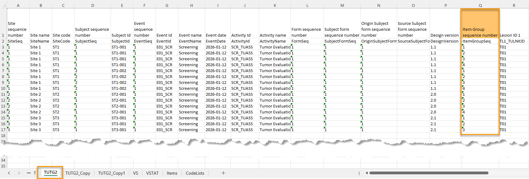 シート名は、試験デザインで定義されている場合はその項目グループの Export OID が使用され、定義されていない場合は item group OID が使用されます。 -