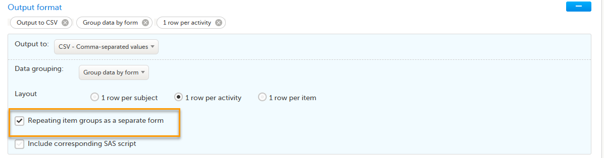 CSV 出力では、「該当するSASスクリプトを含める」オプションを選択することで、リピーティングアイテムグループの構造がサポートされます。SAS 用にフォーマットされた Viedoc データの出力に関する詳細は、SASへの出力を参照してください。