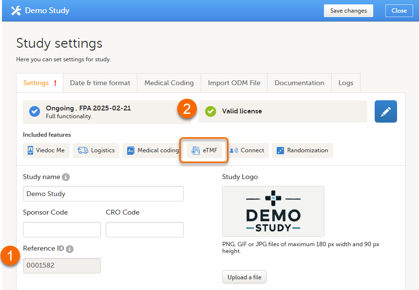 - 試験ライセンスが有効化されたら、再度試験設定を開き、ライセンスが有効であること、そして機能一覧に eTMF アイコンが表示されていることを確認してください。