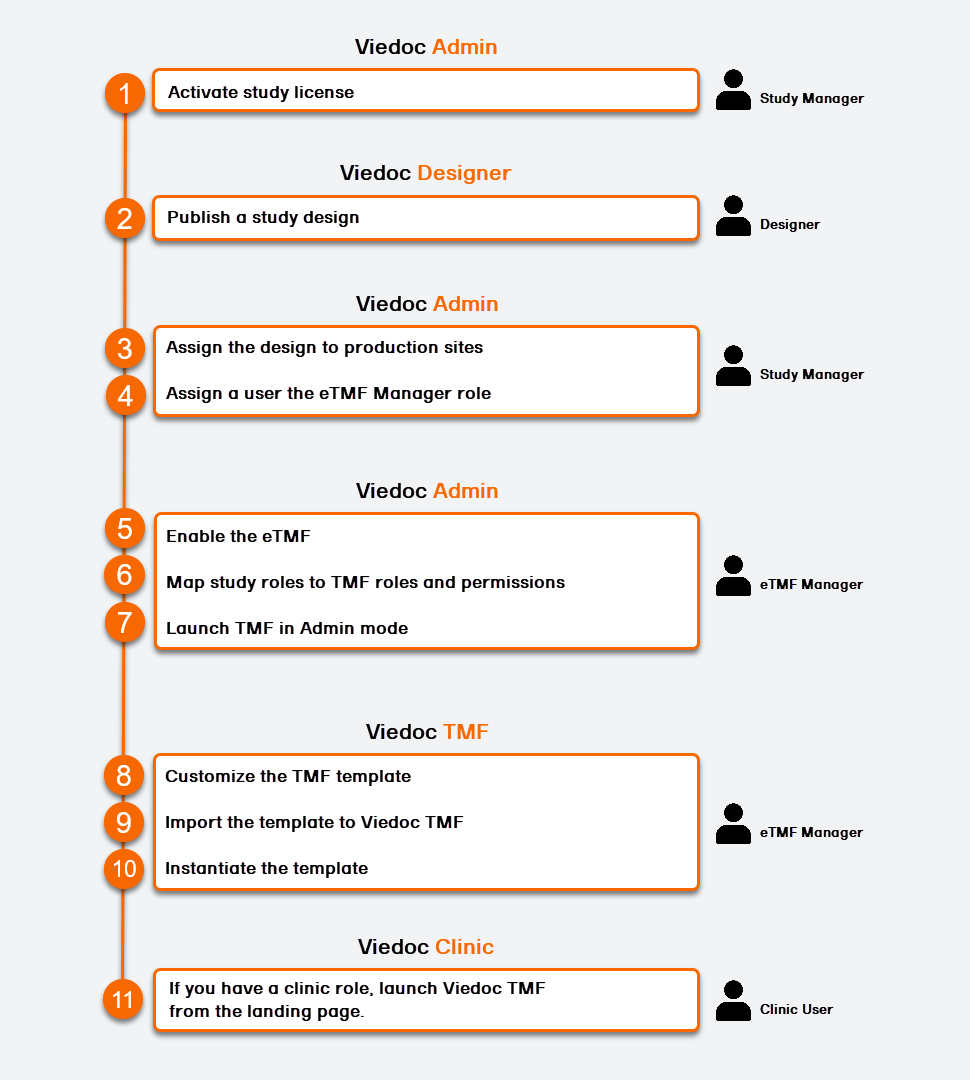 Viedoc TMF を設定するには、以下のクイックガイドに従ってください。詳細な手順については、この後のセクションおよび参照リンクをご覧ください。