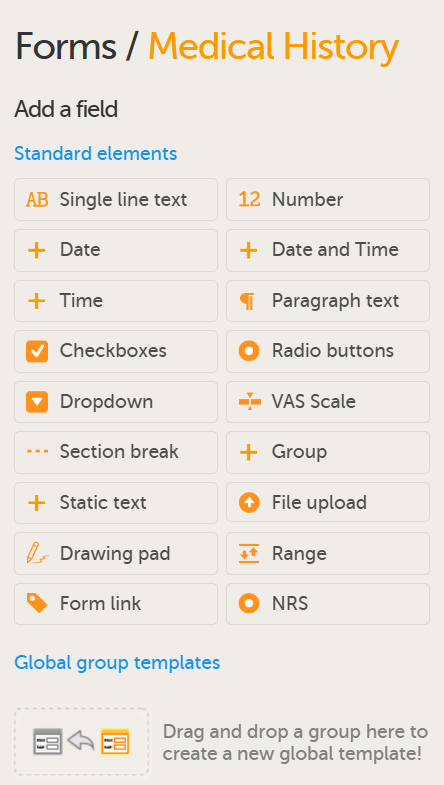 You can also create item groups using global item group templates. Global group templates are available on the Forms page.