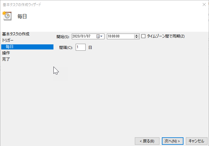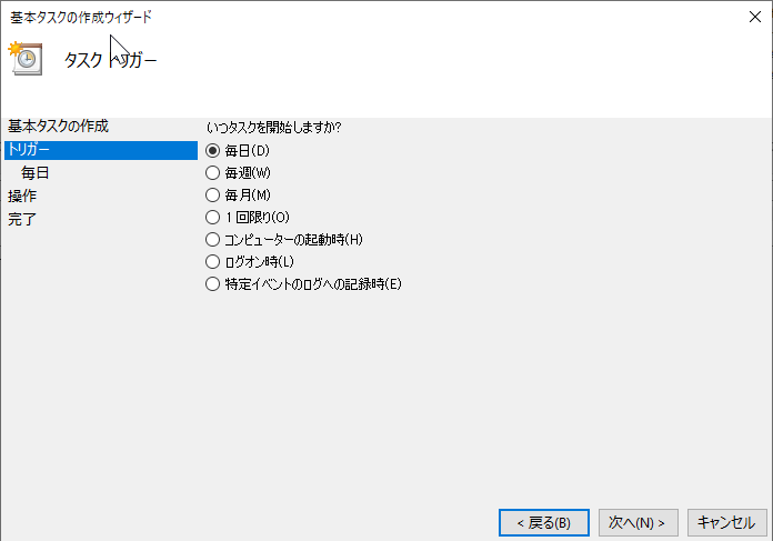 タスク トリガーダイアログで毎日を選択して、次へをクリックします。