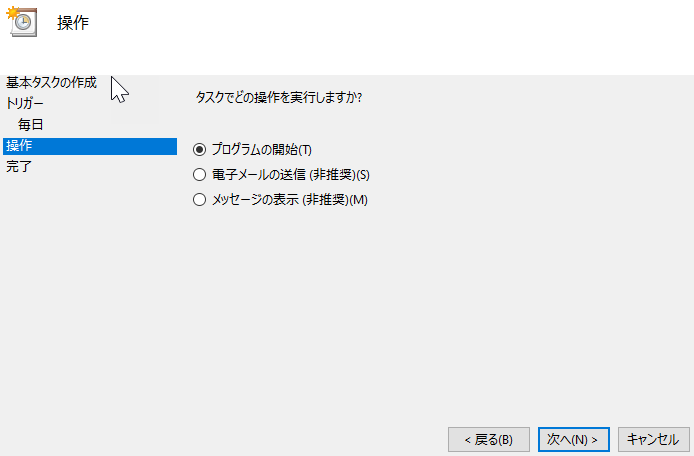 操作 ダイアログでプログラムの開始 を選択して次へをクリックします。