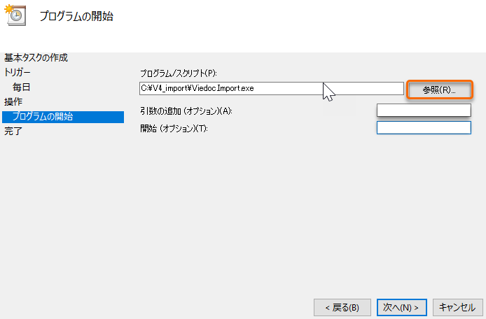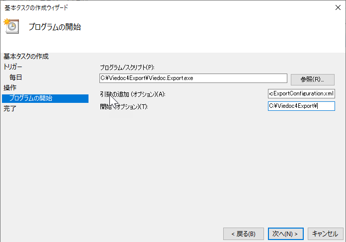 プログラムの開始ダイアログのプログラム/スクリプトフィールドに、エクスポートアプリケーションのファイルパス(例: C:\Viedoc4Export\Viedoc.Export.exe) を入力します。 引数の追加(オプション)にコンフィグレーションファイルへのパスを入力します。