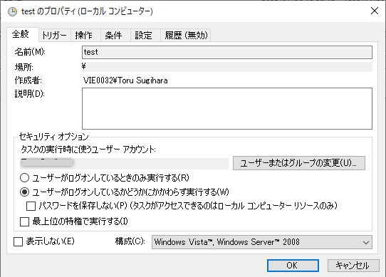 全般タブで、ユーザーがログオンしているかどうかに関わらず実行するを選択し、OKをクリックします。