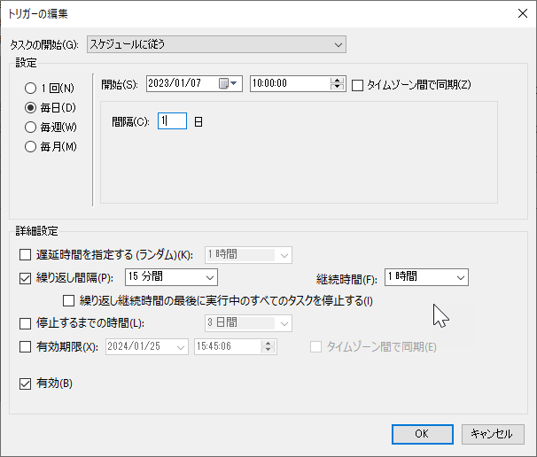 繰り返し間隔を選択し、実行継続時間と実行頻度などの詳細を設定でききます。これにより、開始時間より継続時間の間に、繰り返し間隔でアプリケーションが実行します。