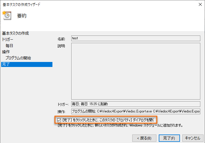 [完了]をクリックしたときに、このタスクの[プロパティ]ダイアログを開くを選択し、完了をクリックします。