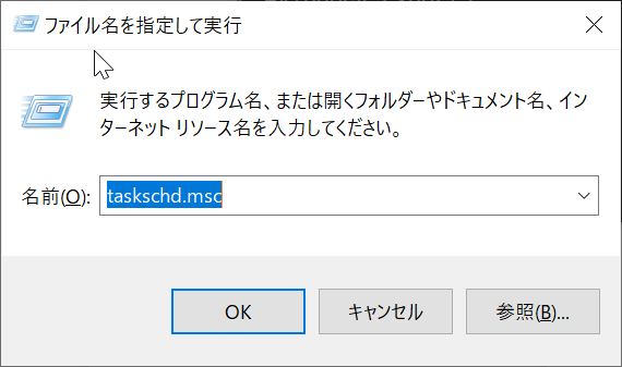 タスクスケジューラを開きます。 *Windows デスクトップ画面でキーボードの[Windows]+[R]キーを同時に押します。開いたファイル名を指定して実行ダイアログでtaskschd.msc を入力してOKをクリックします。