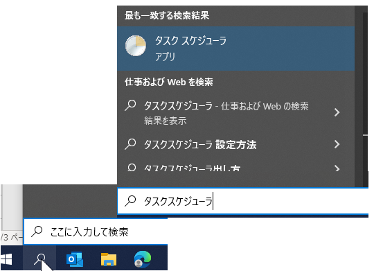 もしくは ここに入力して検索にタスクスケジューラと入力して検索し、実行します。