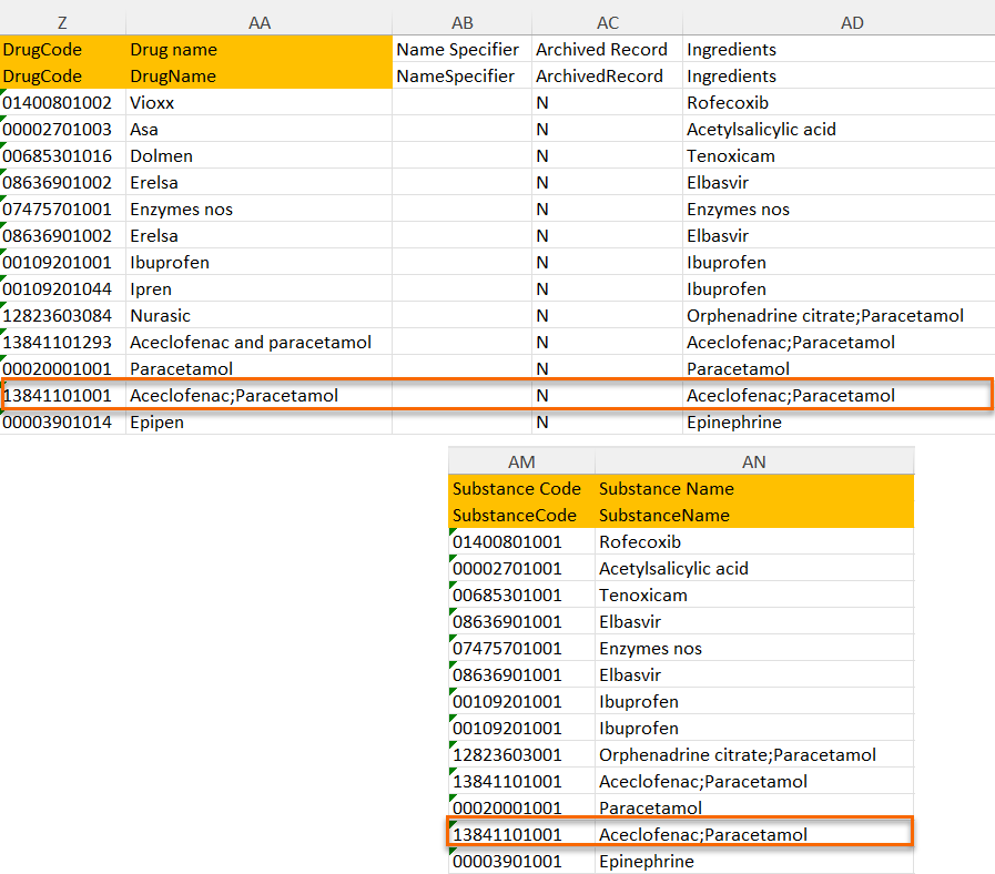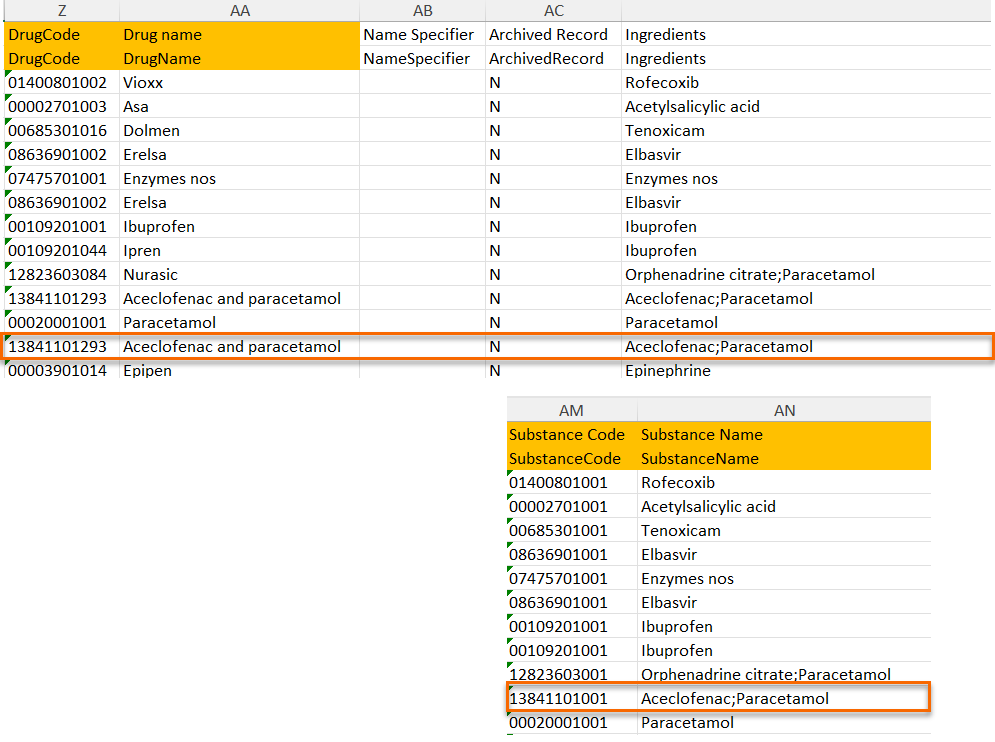 When Drug is selected, the Substance code and Substance name are shown in the export as well, in the last columns, as illustrated in the image.