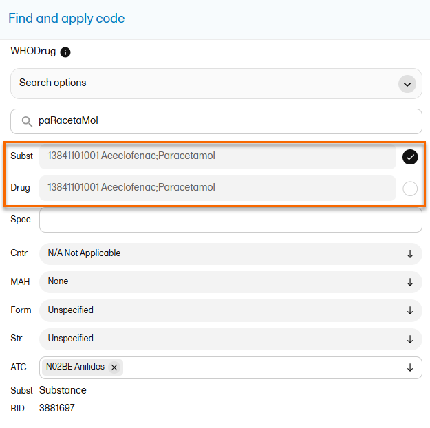After Subst is selected and the code is applied, for the respective coded item, the value of the substance is shown in in both Subst and Drug fields, Viedoc Clinic, as well as in the exported output.