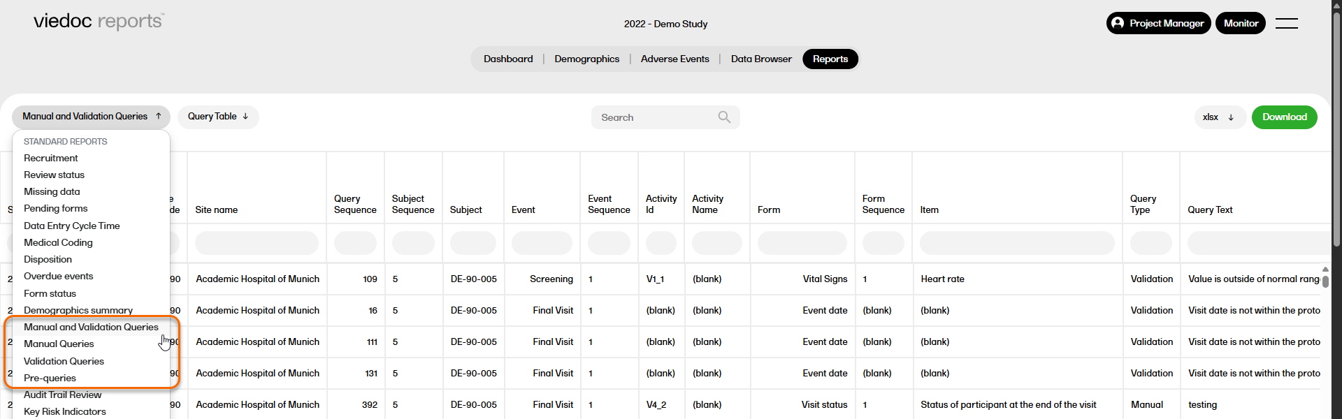 TIP! Many of the standard reports can now be downloaded and customized for use as custom reports. To access the report scripts, please go to the example-standard-reports repository on Viedoc's GitHub.