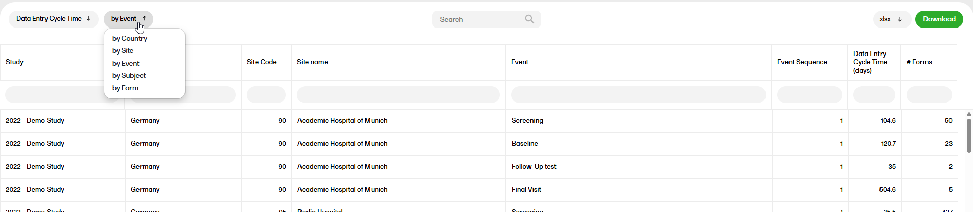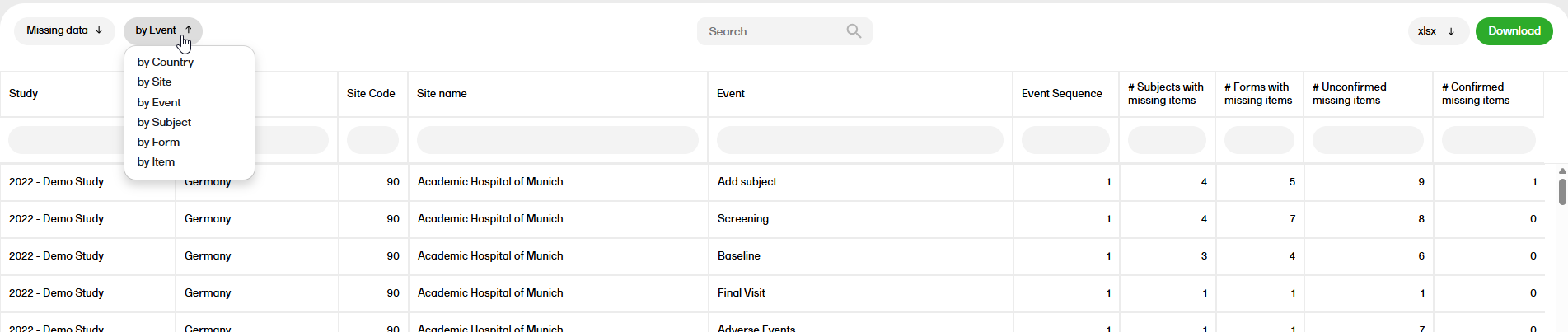2. Click to select the sorting, where applicable: by country/site/event/subject/form/item.