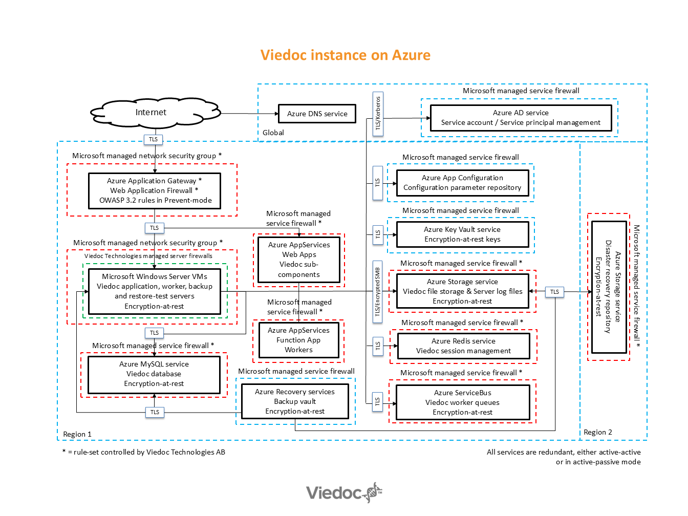 A mix of Microsoft Azure services (application gateway, storage, MySQL, and Redis databases) and Microsoft Windows VM:s (application, worker/task-runner) are used to operate Viedoc. All services / components are redundant.