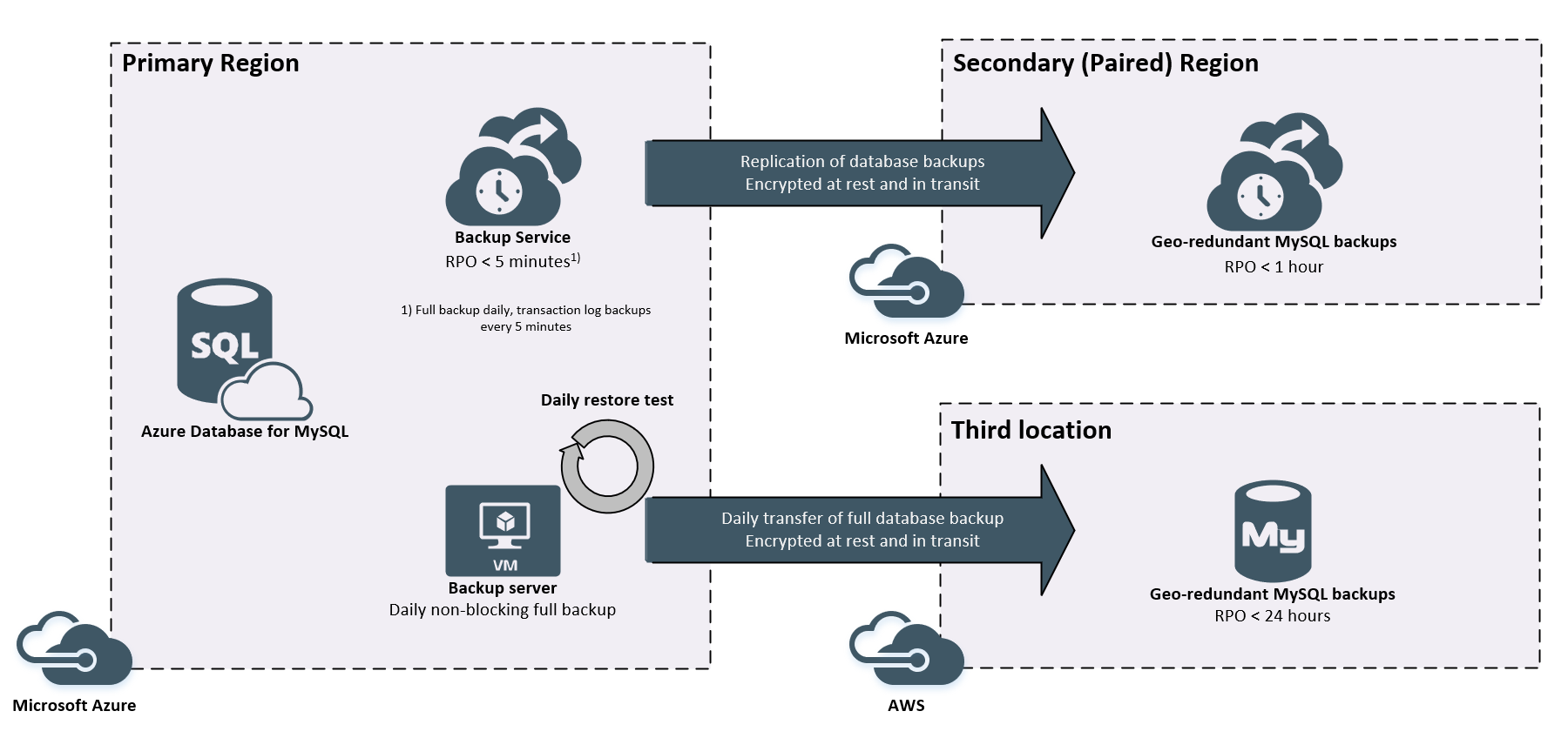 Backups are taken, encrypted and replicated to the paired Microsoft Azure region every five minutes. One full backup for each instance is restored and tested for integrity, then encrypted and transferred to a third location every 24 hours.